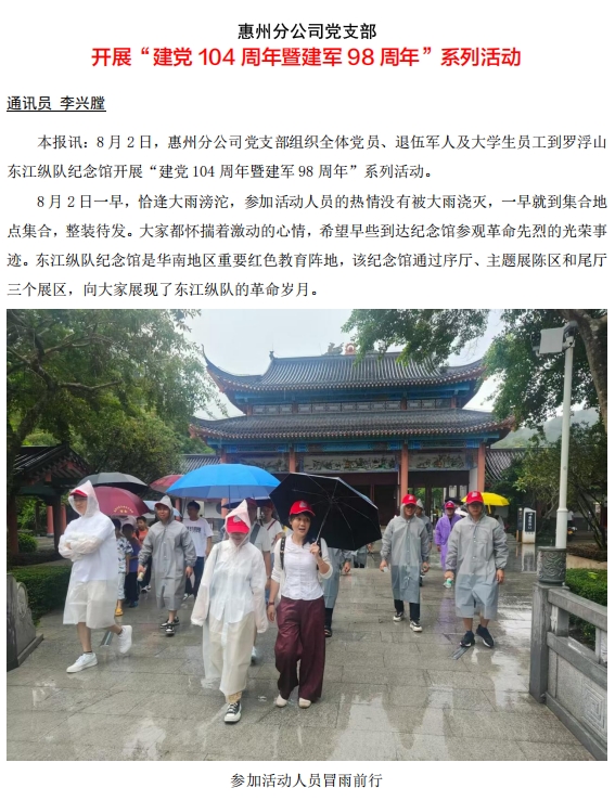 惠州分公司黨支部開(kāi)展“建黨104周年暨建軍98周年”系列活動(dòng)