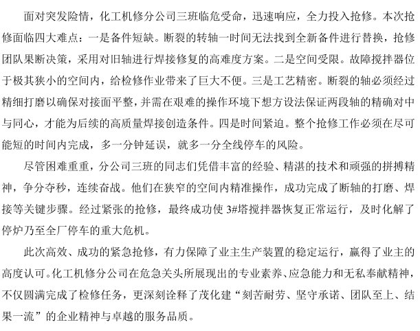 聞令而動!化工機修分公司高效搶修守護業(yè)主生產生命線